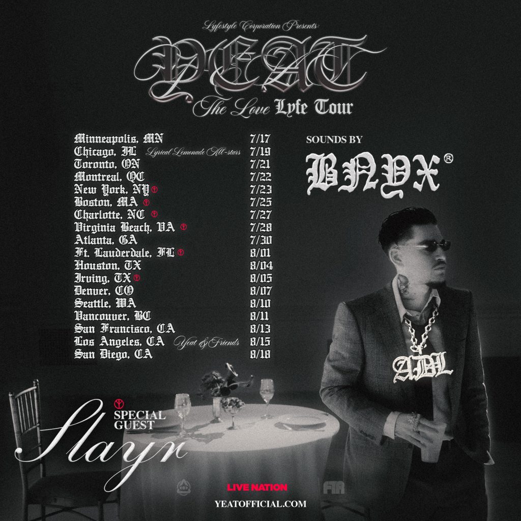 Chart-topping viral sensation Yeat wants the world to know he’s back and coming for the throne. With the recent release of his jaw-dropping new double album ADL (A Dangerous Lyfe / A Dangerous Love), Yeat has announced he will be setting out on the “LOVE/LYFE Tour” across North America with support from Slayr and BNYX in select cities.